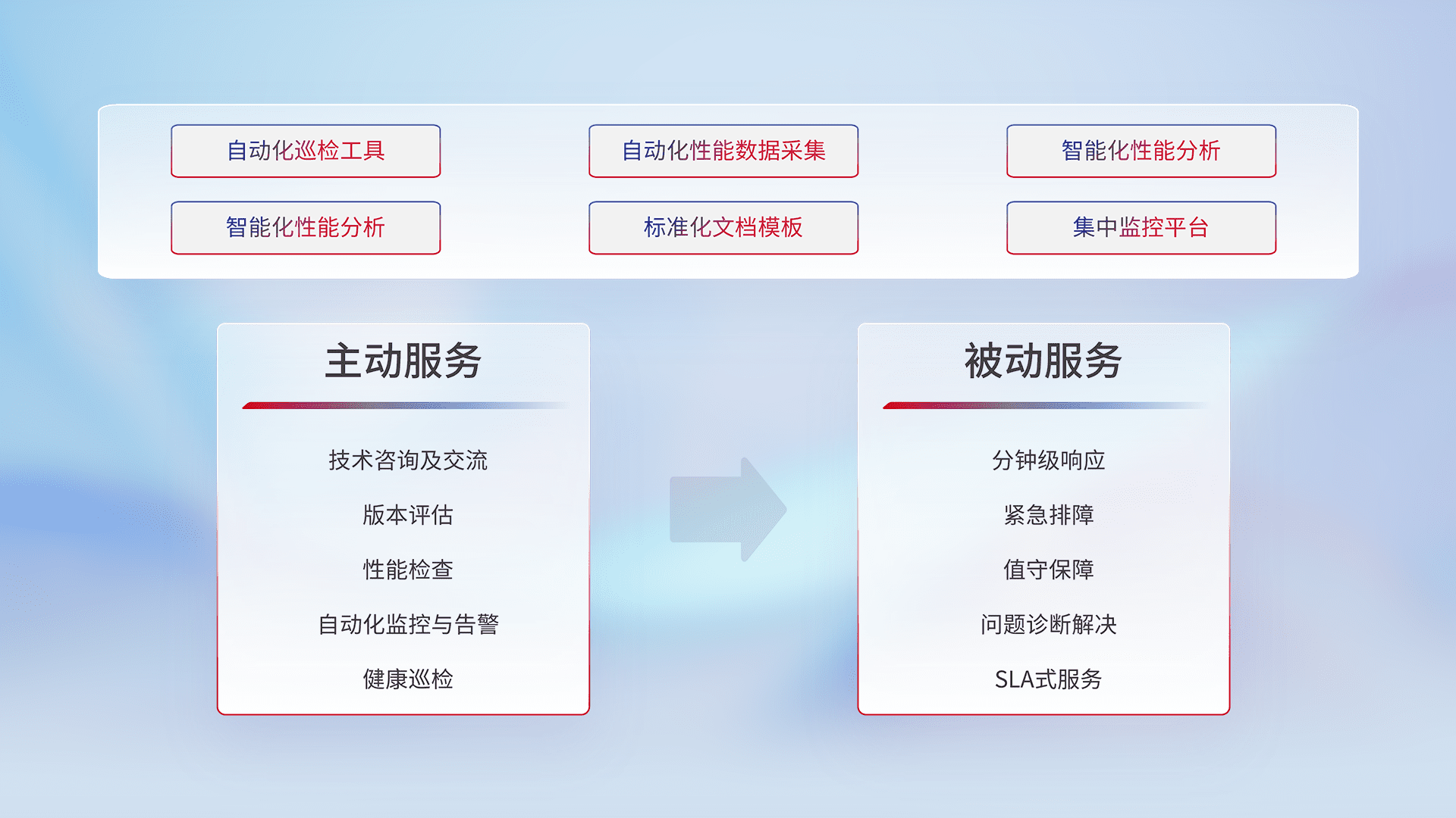智能化工具和标准化文档,,保障服务质量,,提供主动服务(包含技术咨询、、版本评估、、、性能检查、、、、自动化监控与告警、、、健康巡检)和被动服务包含(分钟级响应、、紧急排障、、、值守保障、、、问题诊断解决、、、、SLA服务)。。