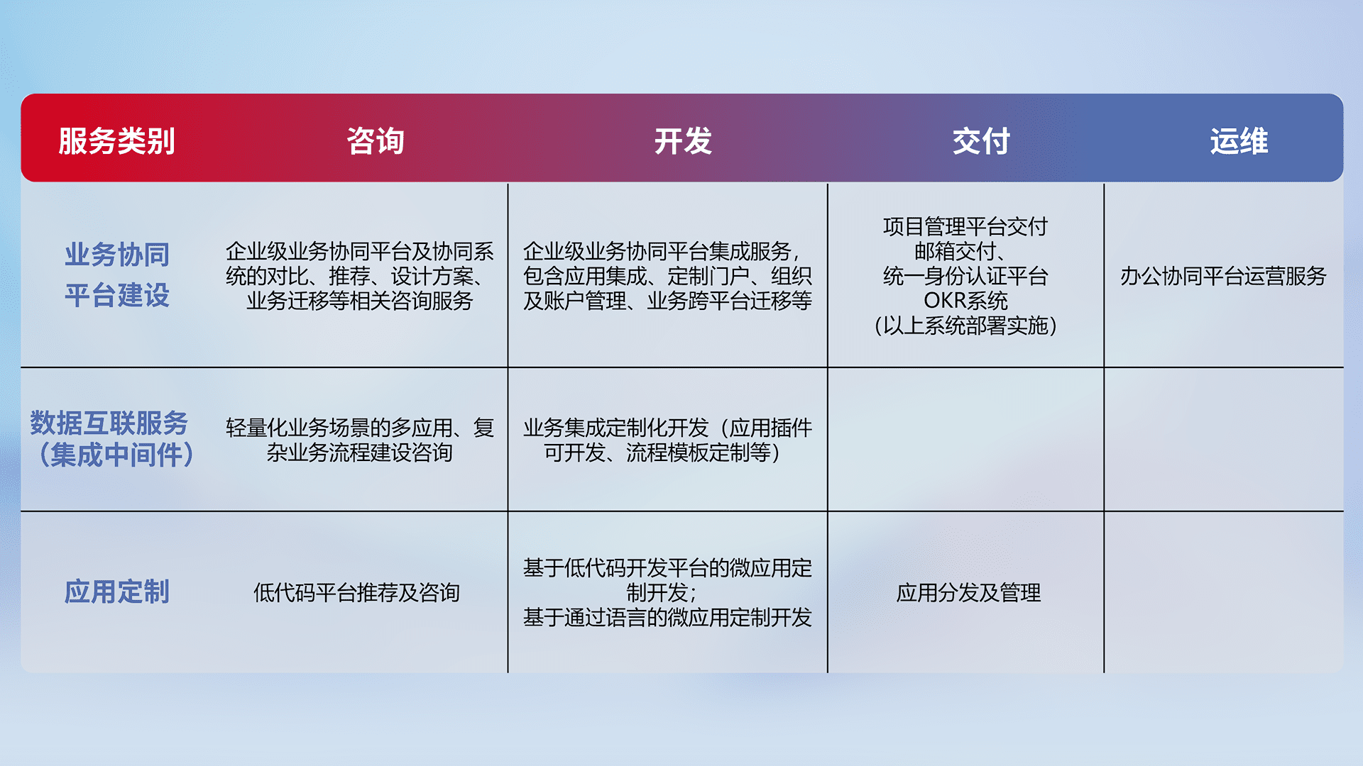 针对钉钉、、、、企微、、IDaas等平台级产品提供产品的规划、、、、方案、、、交付、、定制化开发等服务,,,,实现如统一协同办公、、、智能客户服务、、混合会议管理、、、、智能数据查询、、等业务场景,,实现数字化转型。。。